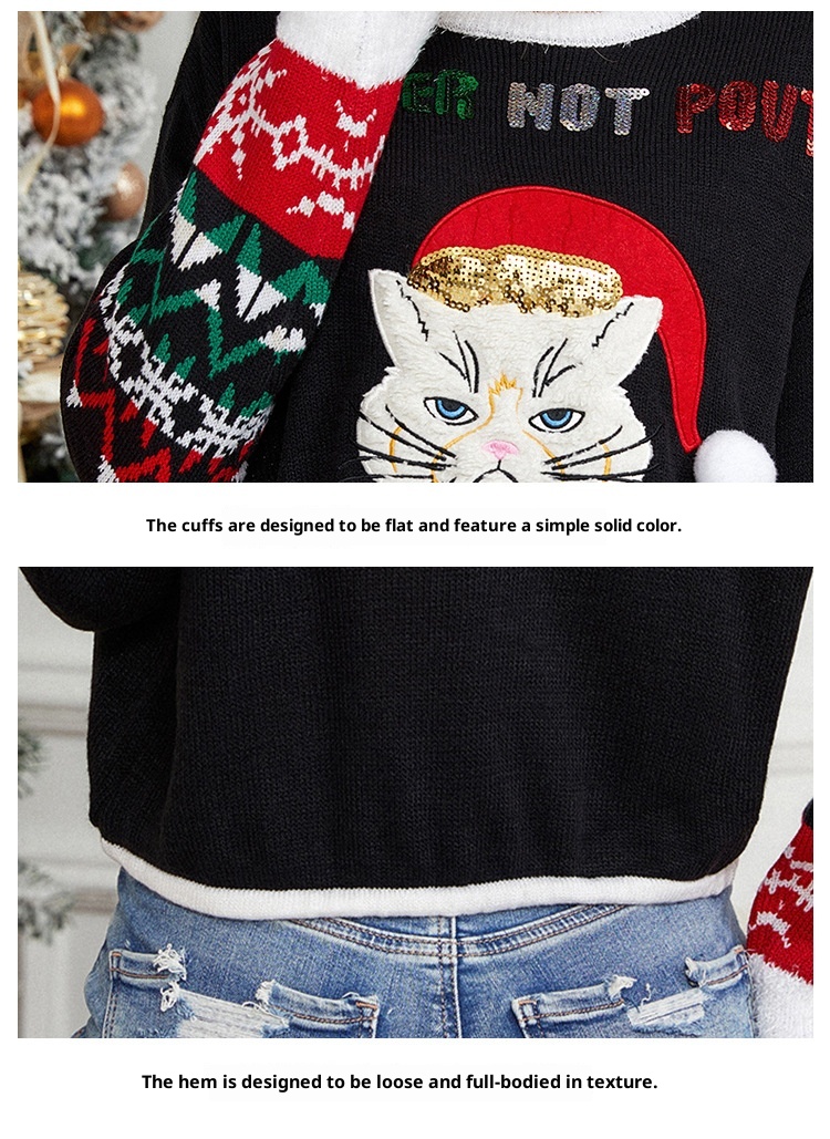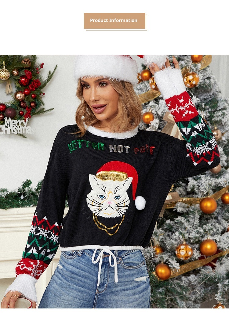 Sequined Embroidered Cat Short Jacquard Christmas Sweater